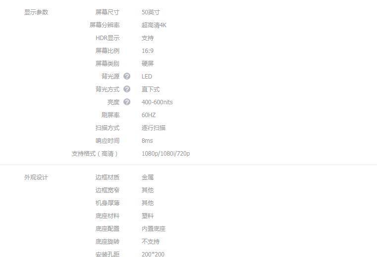 屏幕尺寸50英寸屏幕分辨率超高清4KHDR显示支持屏幕比例16:9屏幕类别硬屏背光源