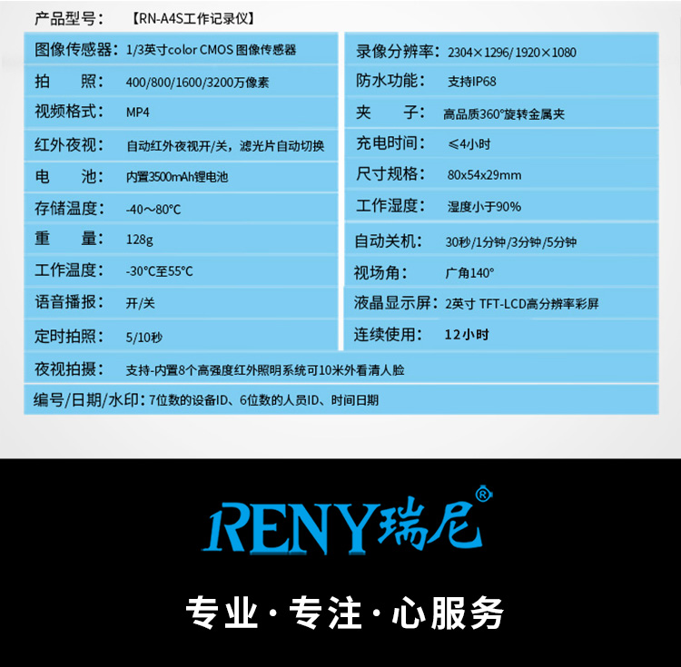 瑞尼(RENY)RN-A4S 高清执法记录仪 专业防摔防水 1296P红外夜视12小时持续录像 内置64G 便携式现场记录仪