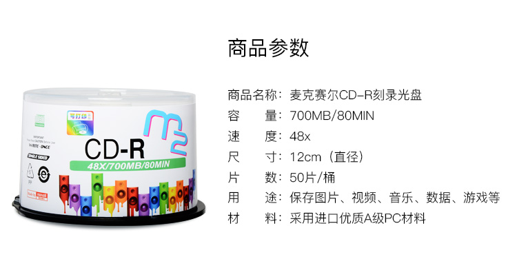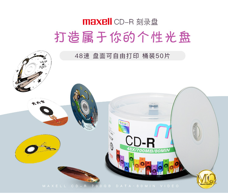 麦克赛尔(maxell)CD-R光盘 刻录光盘 光碟 空白光盘 可打印光盘 M2系列48速700M 50片/桶